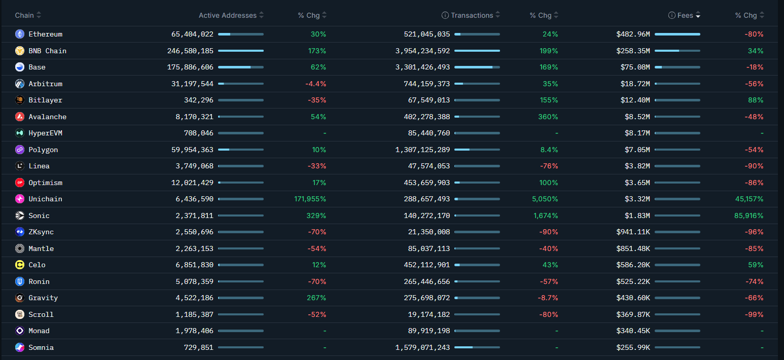 Ethereum vẫn tiếp tục đóng vai trò nền tảng thanh toán cho hệ sinh thái EVM. Phí mạng đạt 482,9 triệu đô la, ngay cả khi giảm khoảng 80% so với mức đỉnh. Điều này xác nhận vai trò của Ethereum trong việc bảo vệ các giao dịch giá trị cao chứ không phải khối lượng xử lý lớn.