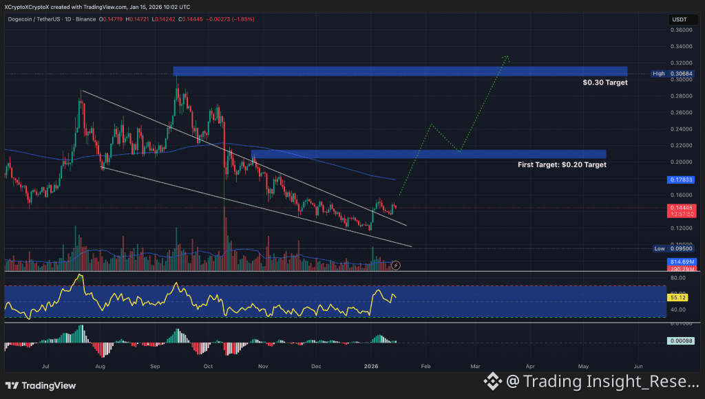 $DOGE đã xác nhận một đáy sau cao hơn (higher low) và cú breakout khỏi mô hình cái nêm giảm kéo dài 5 tháng, báo hiệu một xu hướng tăng mới. Tuy nhiên, con đường tới đỉnh cao mới chưa hoàn toàn thông thoáng một "Vùng Kháng Cự Hợp Lưu" mang tính lịch sử đang đứng chắn như một con trùm cuối.