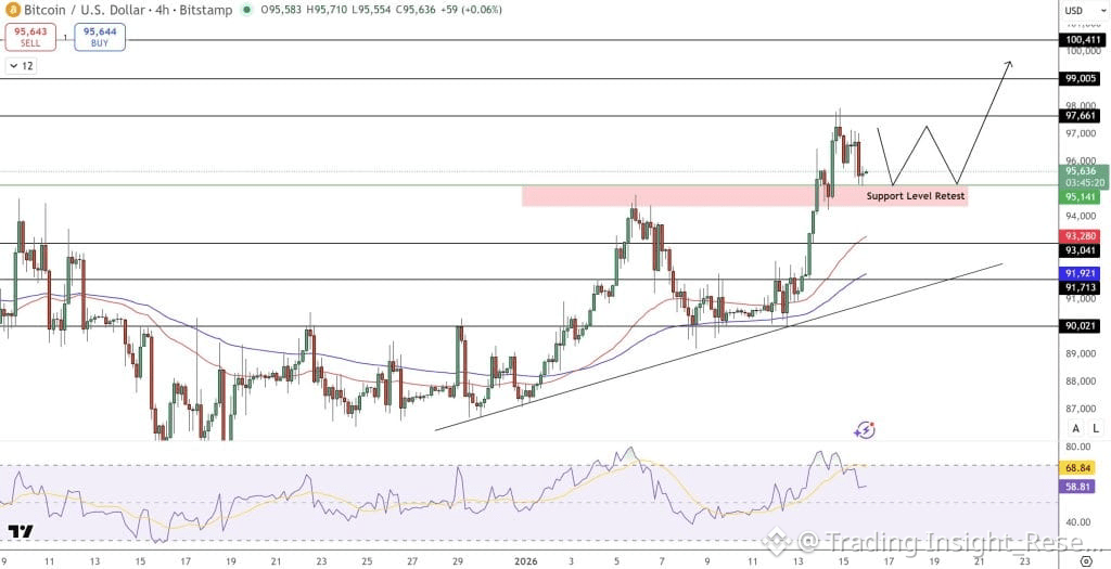🔹 Cấu trúc vẫn là tăng giá. RSI đã reset về vùng 55-60 (lành mạnh), và hành động giá đang hình thành mô hình Cờ Tăng (Bullish Flag). Miễn là BTC giữ trên $93,300 (vùng cầu quan trọng), các nhịp nhúng về $94.5k - $95.1k là cơ hội mua. Một cú phá vỡ qua $97,600 sẽ mở toang cánh cửa tới $100,000.