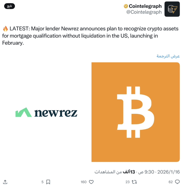 Công ty Newrez, một trong những nhà cho vay thế chấp lớn nhất tại Mỹ, đã công bố một chính sách mới cho phép người vay sử dụng tài sản kỹ thuật số của họ để đủ điều kiện nhận khoản vay thế chấp mà không cần phải bán chúng. Chương trình dự kiến sẽ bắt đầu vào tháng Hai năm 2026.