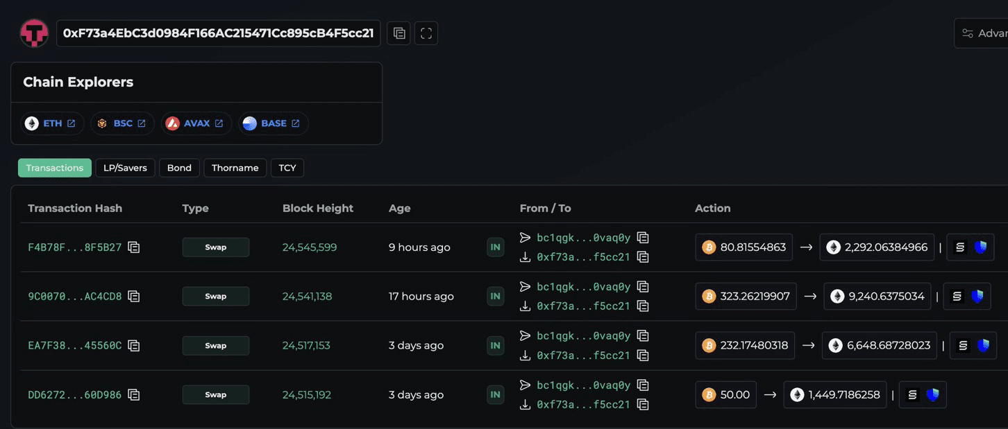 Một con cá voi tiền điện tử lớn đã chuyển một số vốn lớn từ $BTC đến $ETH , trong một dấu hiệu cho sự thay đổi đáng kể trong vị trí của ví. Theo dữ liệu theo dõi trên blockchain, địa chỉ được biết đến với tên 0xF73a đã trao đổi 404 Bitcoin, trị giá gần 38,62 triệu đô la, đổi lấy 11,533 Ethereum trong vòng một giờ qua.