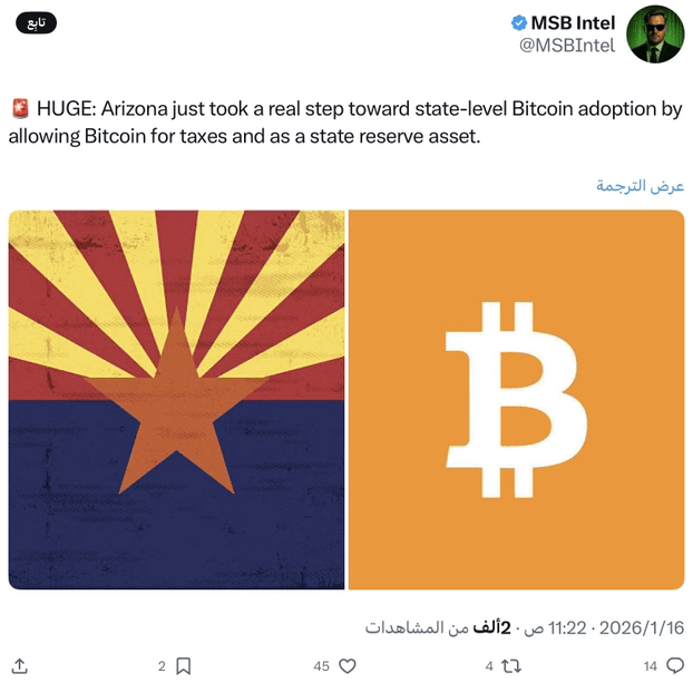Tiểu bang Arizona đang thực hiện một bước đi lớn hướng tới việc áp dụng $BTC trên toàn tiểu bang. Hội đồng lập pháp tiểu bang đã đưa dự luật SB1128 vào lần đọc thứ hai vào ngày 16 tháng 1 năm 2026. Dự luật cho phép các cơ quan chính phủ chấp nhận Bitcoin để thanh toán thuế, phạt và lệ phí thông qua các nhà cung cấp dịch vụ bên thứ ba.