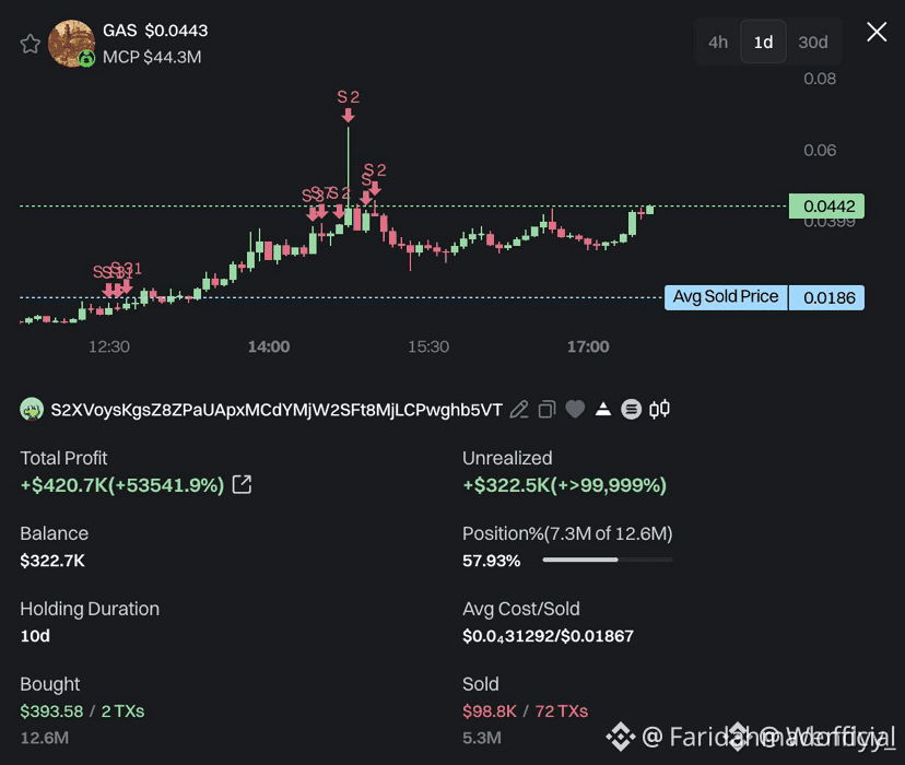 Crucially, the trader is still holding 7.3M $GAS, currently valued at ~$322.5K, meaning the position is far from fully exited.