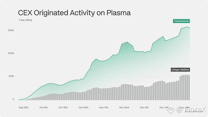 Ở lớp phân phối, con số hơn 30 sàn đã hỗ trợ USDT trên Plasma không chỉ mang ý nghĩa “niêm yết”. Điều quan trọng hơn là mức độ sử dụng thực tế. Việc số giao dịch USDT từ CEX tăng từ vài nghìn lên hàng chục nghìn mỗi ngày trong bối cảnh thị trường chung đang trầm lắng cho thấy chi phí thấp và khả năng tiếp cận rộng thực sự tạo ra lực hút.