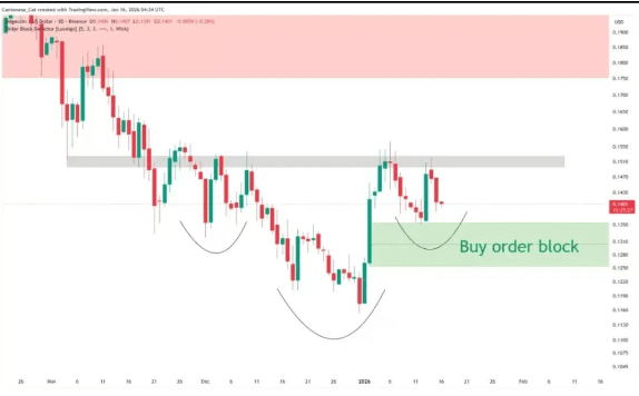 Mức kháng cự chính trên giá hiện tại nằm trong khoảng 0.149–0.152 đô la, mức này đã nhiều lần kìm hãm giá trong đợt phục hồi trước đó. Chỉ khi đóng cửa liên tục đứng vững trên khu vực kháng cự này, mô hình đầu vai đảo ngược mới có thể được xác nhận là bứt phá hiệu quả, từ đó mở ra không gian tăng trưởng tiếp theo.