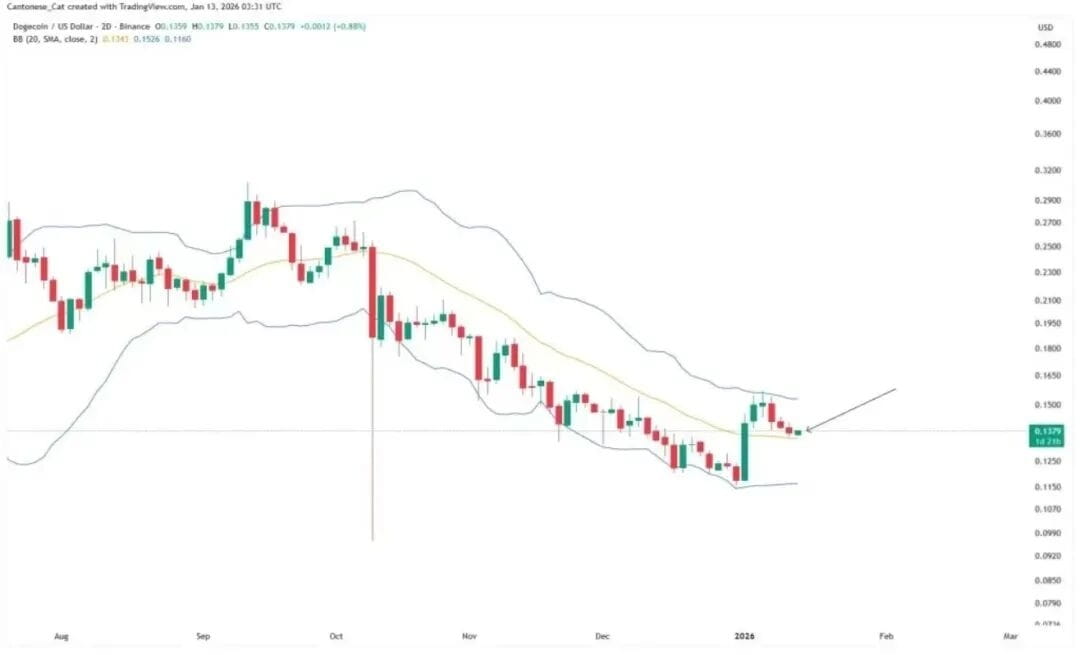 Trong phân tích dải Bollinger của biểu đồ hai ngày, giá hiện tại đã hồi phục lên trên đường giữa (khoảng 0.1343 đô la), và kháng cự trên nằm ở 0.1526 đô la, trùng với kháng cự quan trọng trên biểu đồ hàng ngày. Điều này cho thấy nếu giá có thể vượt qua khu vực 0.152 đô la, không chỉ hoàn thành sự bứt phá ở cấp độ hàng ngày mà còn xác nhận tín hiệu gia tăng động lượng trong khung dải Bollinger, có nghĩa là cấu trúc biến động trung hạn có thể chuyển từ giảm sang tăng.