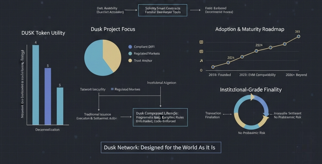Điều đã giữ cho cuộc thảo luận của tôi tiếp tục là cách mà Dusk định vị bản thân một cách có chủ đích. Nó không cố gắng thay thế Ethereum. Nó không cạnh tranh với các đồng tiền riêng tư về tính ẩn danh. Nó đang định hình một lối đi mà hầu hết các blockchain tránh vì nó khó khăn: DeFi tuân thủ, thị trường được quy định, và việc áp dụng tổ chức mà không làm tổn hại đến phân quyền. Con đường đó đòi hỏi sự kiên nhẫn, sự lặp lại chậm rãi và uy tín với các cơ quan quản lý và các thực thể tài chính. Nó không lòe loẹt, nhưng nó bền bỉ.