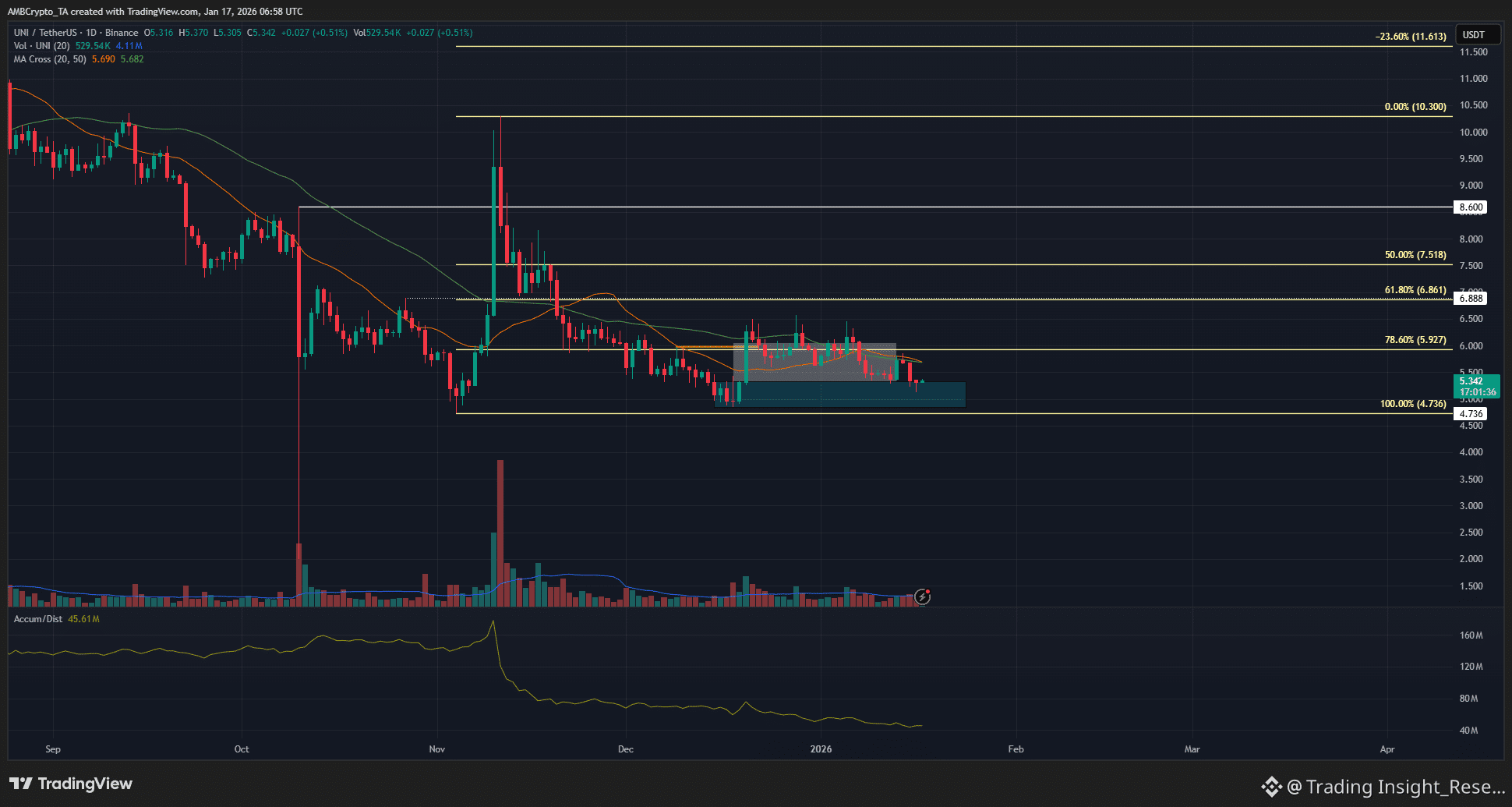 UNI đang giao dịch dưới các đường DMA 20 và 50. Việc thất bại trong giữ mốc $6 xác nhận xu hướng giảm trên khung ngày. Nếu thủng $4.73, kịch bản tăng giá ngắn hạn sẽ bị vô hiệu hóa.