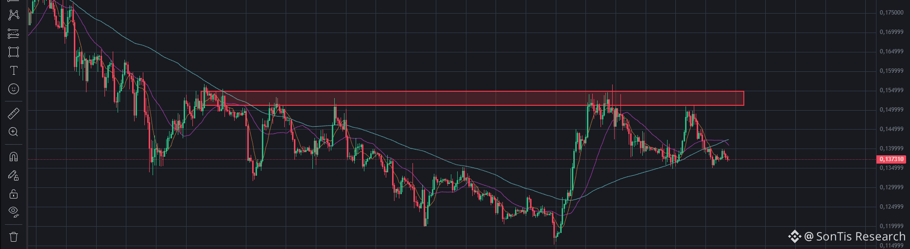 🔸Mốc 0,15 USD đã trở thành rào cản không thể vượt qua đối với DOGE. Trong 10 ngày qua, đồng tiền này đã có 4 lần nỗ lực bứt phá nhưng đều bị đẩy lùi, dẫn đến chuỗi 6 ngày giảm điểm liên tiếp trước khi tạm thời tìm thấy sự hỗ trợ tại vùng 0,13 USD