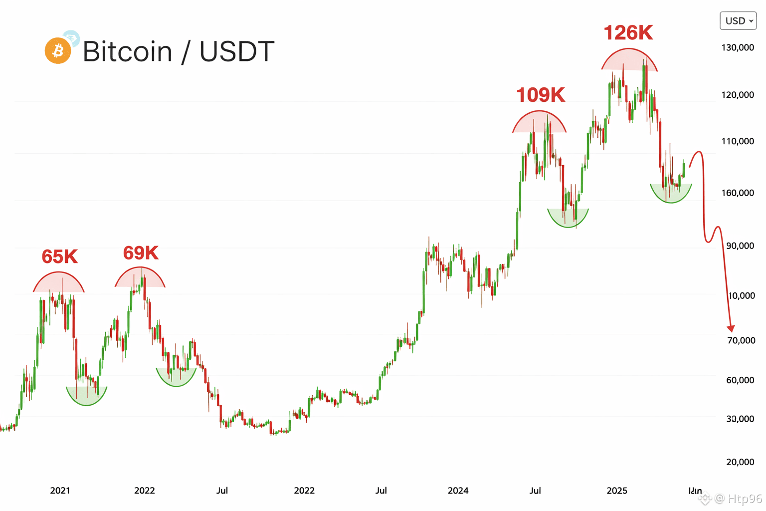 Nếu giữ nguyên cấu trúc này và áp nó lên mức đỉnh gần nhất vào tháng 10/2025, thì mốc thời gian cho vùng đáy kế tiếp rơi khá sát vào tháng 10/2026.