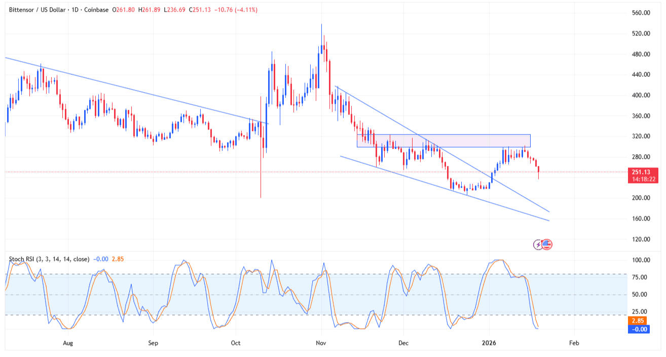 🔸 Phân tích kỹ thuật cho thấy TAO đang bước vào khu vực hỗ trợ sống còn quanh $240 - $250. Đây là hàng phòng thủ cuối cùng của các nhà đầu tư; một sự sụt giảm ở đây sẽ mở rộng cánh cửa cho một cú giảm xuống khu vực $200 - $220.