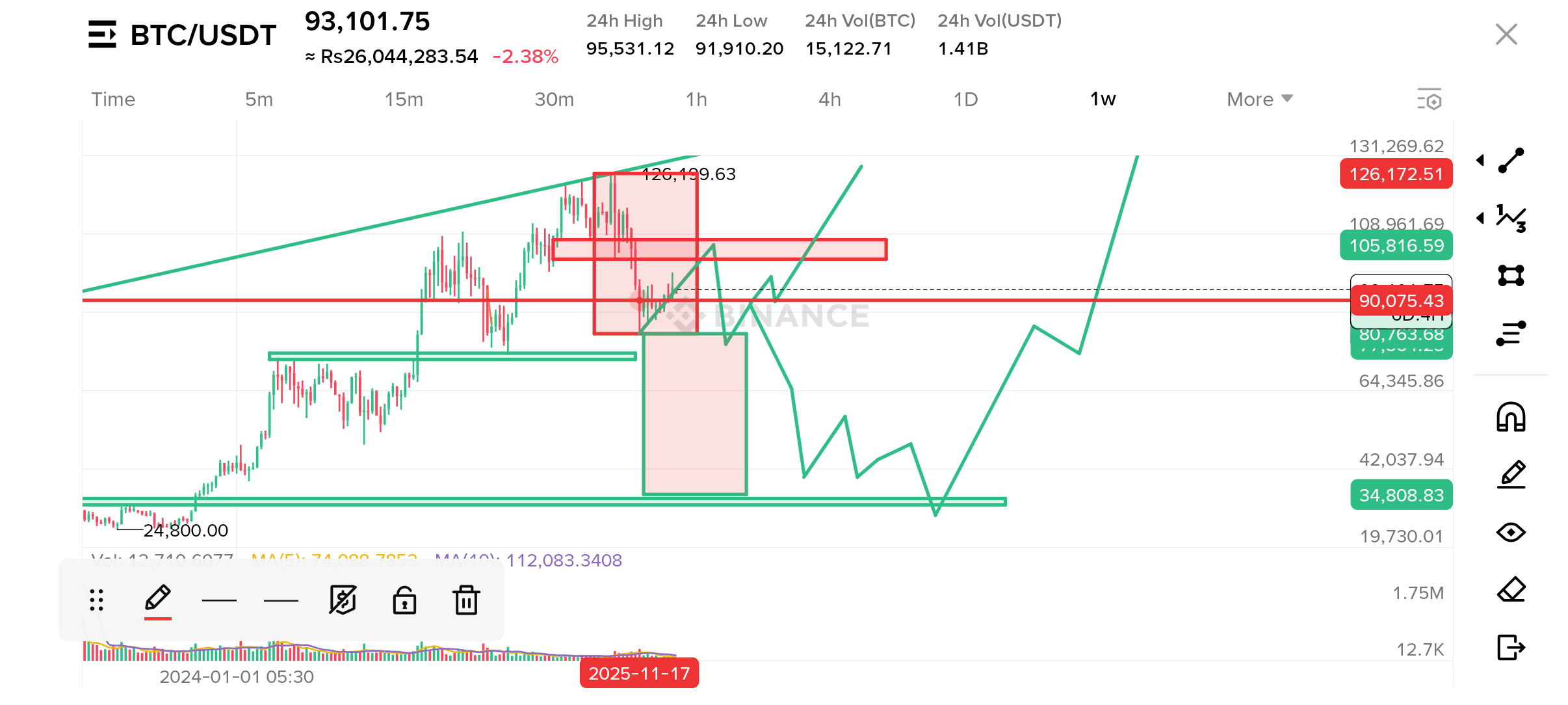 Bitcoin đã rút lui từ 126K và hiện đang ngồi ngay trên khu vực 90K–92K. Khu vực đó rất quan trọng. Nó đã được bảo vệ trước đây, và nếu cấu trúc bò rộng hơn sẽ giữ nguyên, nó cần phải giữ vững một lần nữa.