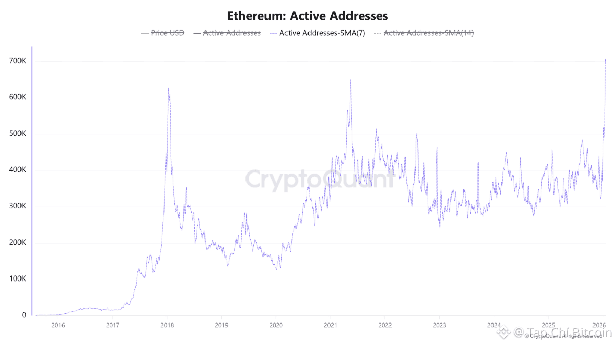 Sự phân hóa trong hành vi nắm giữ diễn ra song song với bức tranh tích cực trên mạng lưới Ethereum. Cuối tuần qua, số địa chỉ hoạt động hàng tuần bứt phá lên mức kỷ lục hơn 706.000 địa chỉ, vượt đỉnh từng thiết lập vào tháng 5/2021. Khối lượng giao dịch hằng ngày cũng đồng thời xác lập mức cao nhất mọi thời đại.