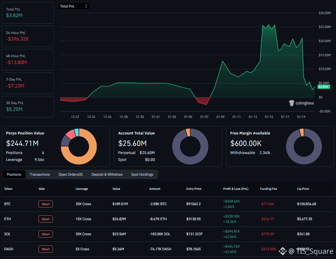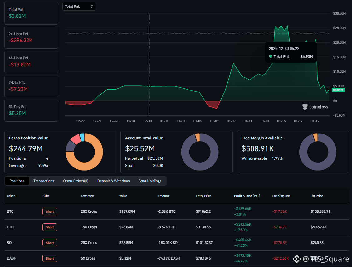 Đang Short $248 Triệu USD BTC và ETH. Lợi nhuận thả nổi đạt +$3.92 Triệu USD.