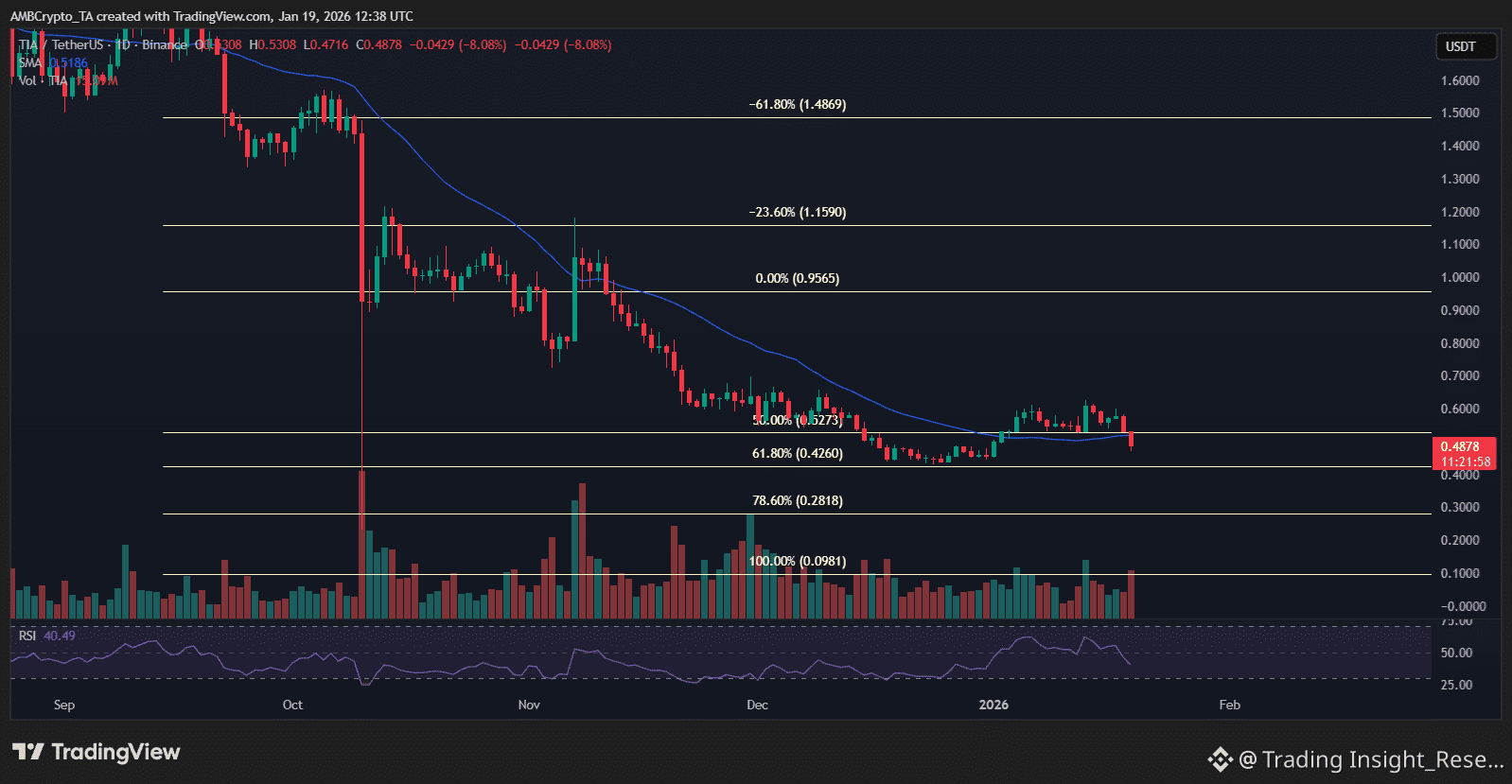 TIA đã đánh mất mức Fib 50% ($0.527) và đường SMA 30 ngày ($0.518), xác nhận sự tiếp diễn của xu hướng giảm.