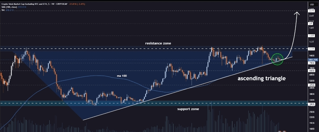 Tổng vốn hóa thị trường tiền điện tử đang giao dịch gần biên dưới của mẫu hình tam giác tăng dần trên khung thời gian hàng tuần 🔍 $XNY