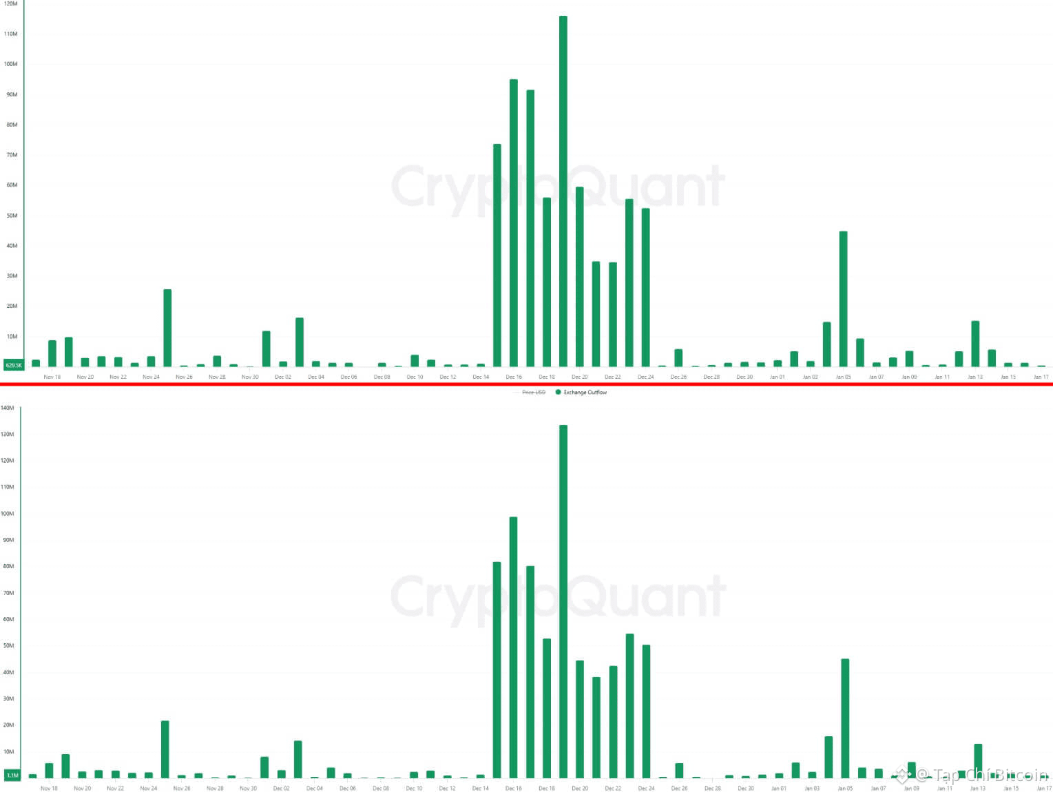 Dòng tiền vào (trên) và ra (dưới) của XRP trên các sàn giao dịch tăng đột biến vào giữa tháng 12, với dòng tiền ra liên tục vượt quá dòng tiền vào cho đến giữa tháng 1, cho thấy xu hướng tự quản lý ròng.