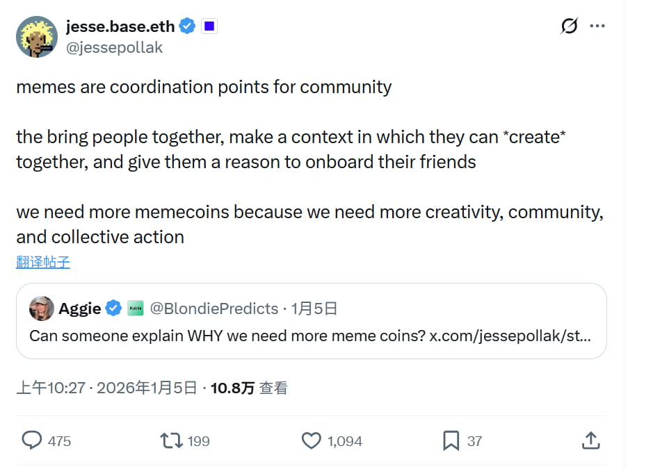 Base链创始人Jesse Pollak提供了一个有趣的视角。他多次强调Meme不仅是投机工具,更是"链上文化的核心"。通过图片、视频、音乐等内容形式,Meme能够吸引数百万新用户上链,成为Web3大规模采用的入口。