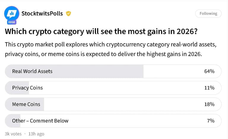 Stocktwits最近的民调显示:64%的投资者认为RWA将在2026年带来最强回报,远超Meme币的12%和隐私币的8%。但这个数字背后藏着一个问题——当散户都开始喊着要配置RWA时,是真的认知升级了,还是只是2025年Meme崩盘后的PTSD反应?
