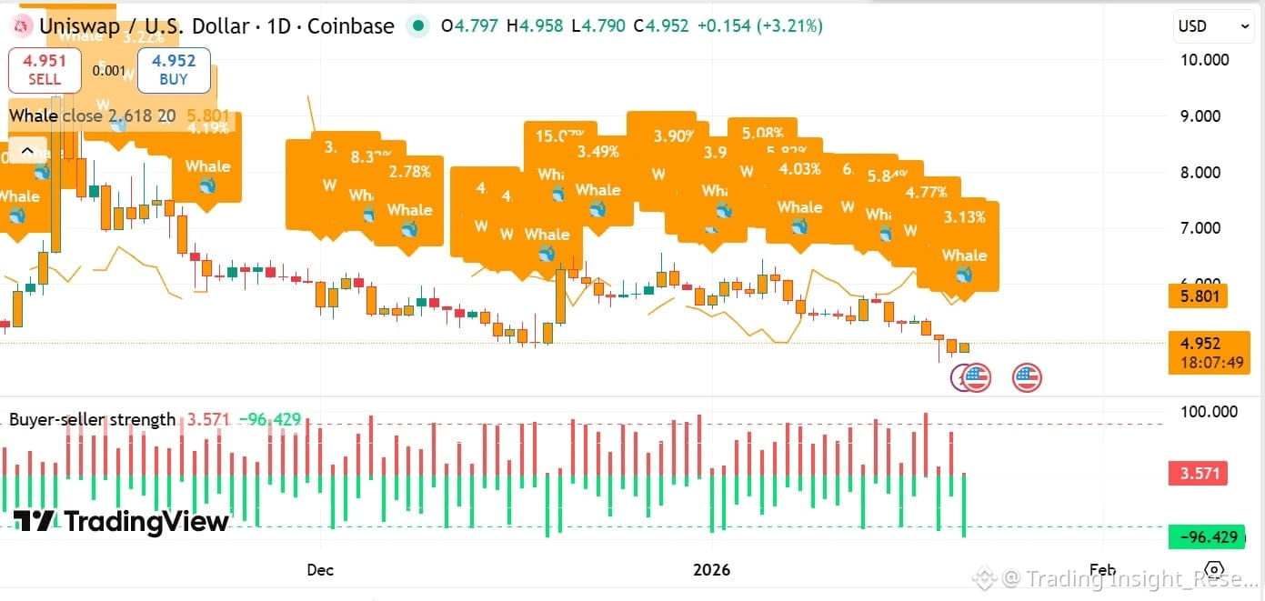 $UNI đang giao dịch tại $4.92, mắc kẹt trong kênh giảm sau khi bị từ chối tại mốc $5.8. Tuy nhiên, một ván cờ thú vị của smart money đang diễn ra Một cá voi bán tháo tại đỉnh vừa quyết liệt mua lại tại đáy, báo hiệu sự thay đổi tâm lý bất chấp hành động giá tiêu cực.