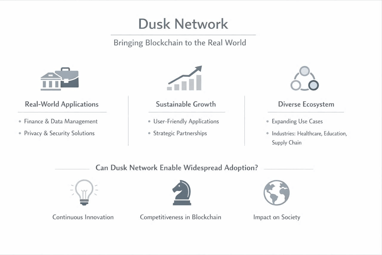 Gần đây, Mạng Dusk đã có những bước tiến trong việc thiết lập một hệ sinh thái blockchain bền vững, bên cạnh việc xây dựng một nền tảng blockchain. Như một phần của nỗ lực này, Mạng Dusk đang phát triển các ứng dụng thân thiện với người dùng mà sẽ dễ dàng tiếp cận cho các doanh nghiệp và tổ chức khác đang tìm cách gia tăng việc sử dụng công nghệ blockchain. Bằng cách tạo ra các quan hệ đối tác chiến lược mới, Mạng Dusk sẽ tiếp tục mở rộng cảnh quan để tạo ra các ứng dụng trong hệ sinh thái blockchain.