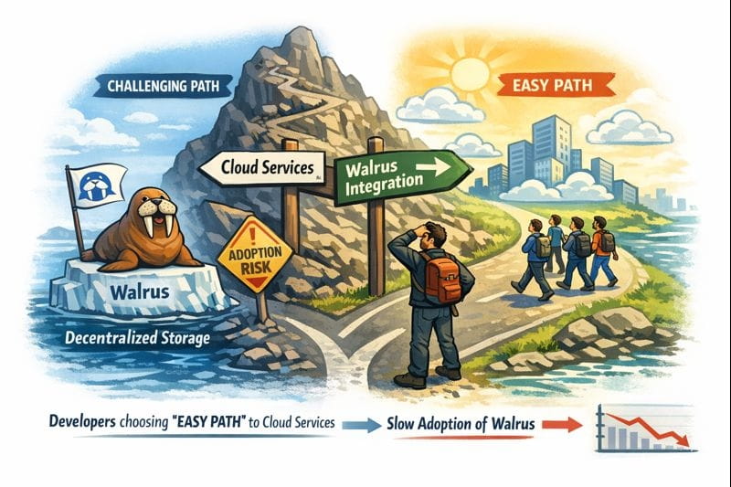 Thứ nhất, rủi ro chấp nhận là có thật. Walrus rất mạnh mẽ, nhưng lưu trữ phi tập trung chỉ hoạt động hiệu quả khi các nhà phát triển chủ động chọn nó thay vì các lựa chọn quen thuộc như dịch vụ đám mây. Nếu các nhà xây dựng không tích hợp Walrus sâu vào các ứng dụng, sự tăng trưởng sử dụng có thể chậm lại, bất kể công nghệ có tốt đến đâu.