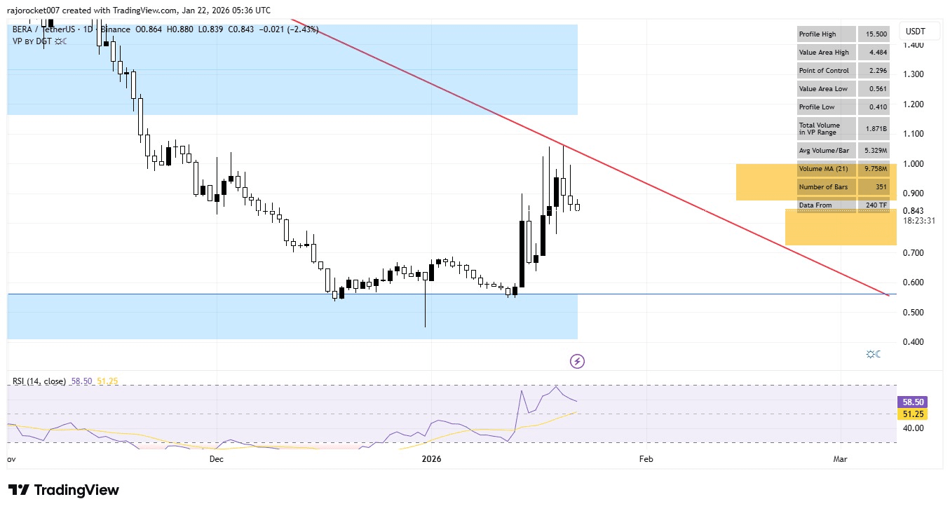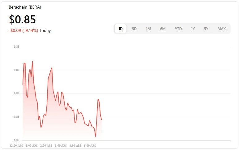 $BERA đang giao dịch quanh $0.85–$0.88 và đã cho thấy sự biến động cao gần đây. Giá đã bật lên từ các mức thấp gần đây nhưng vẫn gặp khó khăn trong việc vượt qua kháng cự cao hơn. Đánh giá kỹ thuật thay đổi theo từng nền tảng, cho thấy tín hiệu hỗn hợp với thiên hướng bán trong ngắn hạn và trung lập đến mua trong một số chỉ báo.