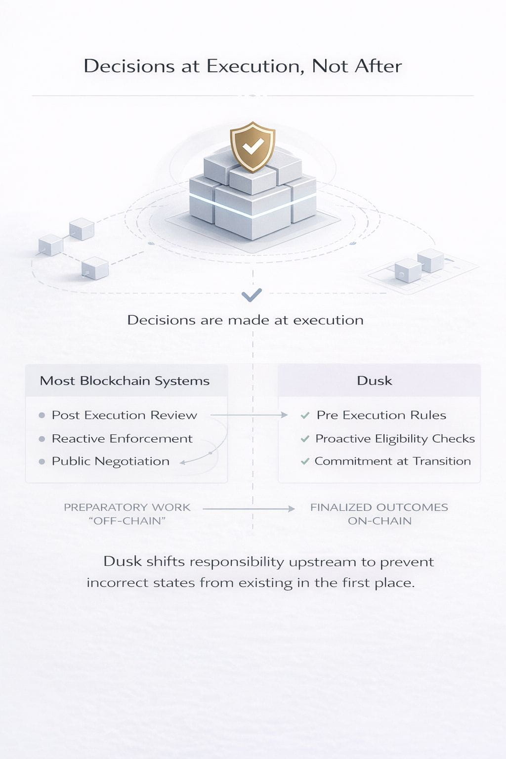 Kết quả là, nhiều hoạt động của Dusk có cấu trúc yên tĩnh. Các định nghĩa quy tắc diễn ra ở phía trên. Các ràng buộc được thiết lập trước khi thực hiện. Khi các giao dịch xuất hiện trên chuỗi, chúng đã được hoàn thiện. Không có thương lượng rõ ràng nào vì thương lượng đã kết thúc.