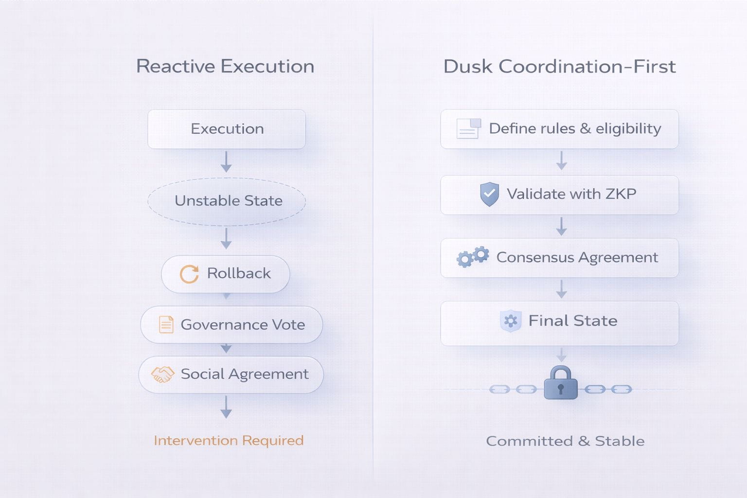 Tính đủ điều kiện không phải là điều mà Dusk cố gắng suy ra sau này. Nó là điều mà hệ thống khăng khăng phải biết trước khi cho phép thực thi. Khi một điều kiện được đáp ứng, và khi sự đồng thuận đưa quyết định đó tiến về phía trước, trạng thái kết quả không được coi là bản nháp. Nó trở nên có thẩm quyền.