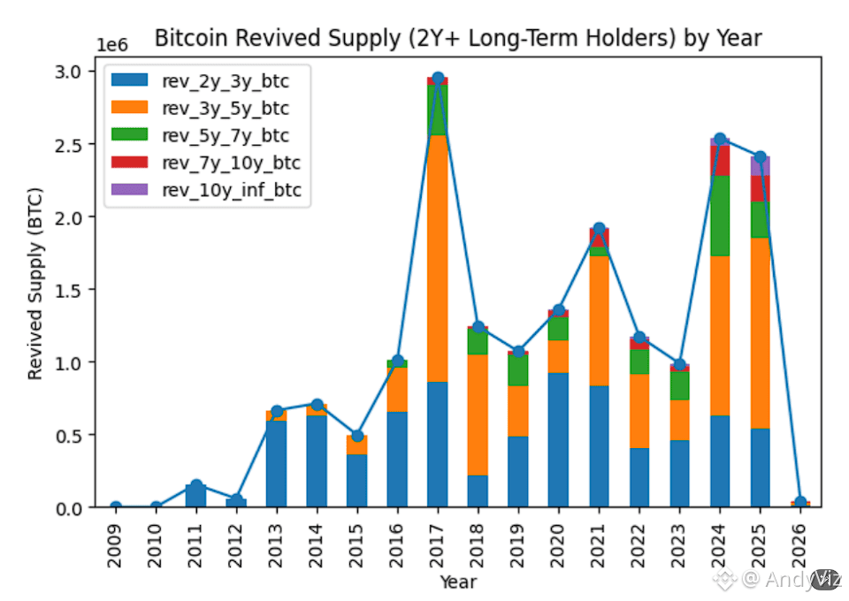 Theo dữ liệu mới nhất từ CryptoQuant, những người nắm giữ $BTC dài hạn (LTH) — đặc biệt là những người đã giữ trên 2 năm — đang thực hiện các đợt bán ra với quy mô lớn chưa từng thấy trong năm 2024 và 2025. Lượng cung Bitcoin được "đánh thức" (revived supply) này đã phá vỡ các kỷ lục lịch sử, vượt qua cả giai đoạn bùng nổ cuối năm 2017.