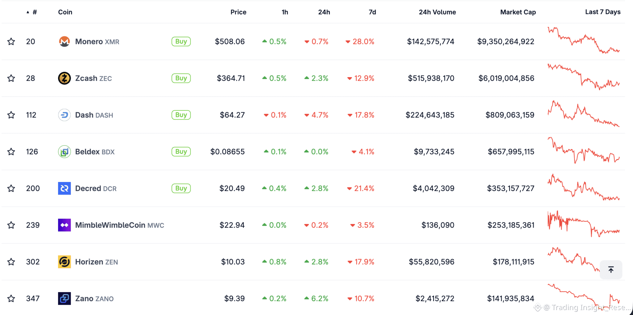 🔹 Sự sụt giảm đồng loạt này không phải do yếu tố cơ bản của từng token đây là một cuộc Thanh Trừng Toàn Ngành. Nhà đầu tư đang tháo chạy khỏi các cuộc chơi ẩn danh/riêng tư để tìm đến sự minh bạch hoặc an toàn.