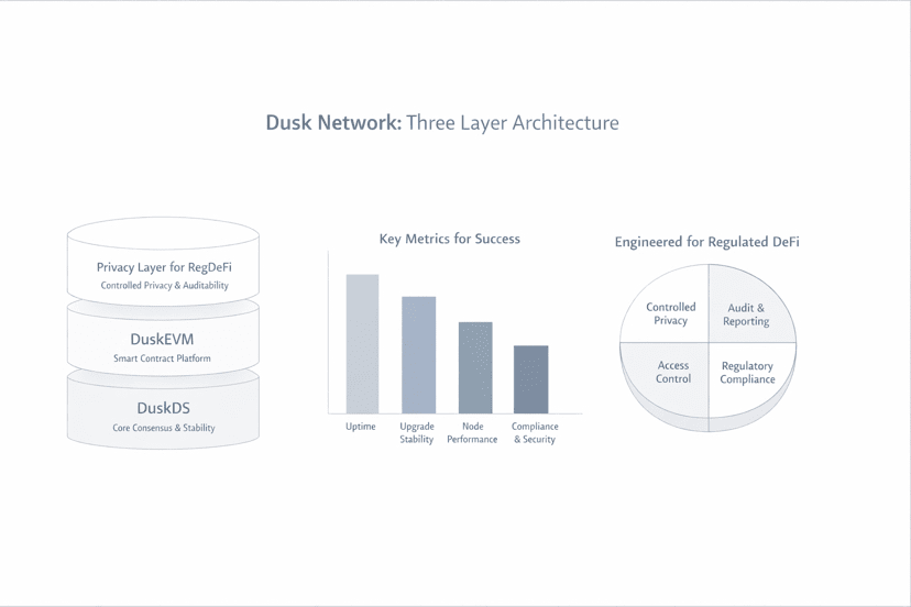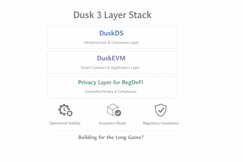 Tôi nhìn vào Dusk công bố một kiến trúc ba lớp với DuskDS, DuskEVM và một lớp bảo mật nhằm vào RegDeFi theo cách mà một người tham gia thị trường lâu năm làm, tôi đã thấy đủ chu kỳ, đủ lời hứa và đủ mạng lưới sụp đổ vì nền tảng không thể chịu được áp lực. Thị trường này thích tốc độ và câu chuyện, nhưng cuối cùng chỉ có hai điều quyết định liệu cơ sở hạ tầng có tồn tại hay không, kỷ luật kỹ thuật và khả năng hoạt động khi điều kiện trở nên xấu. Bạn đã bao giờ xem một dự án nói đẹp về tương lai, sau đó khi lưu lượng tăng vọt, khi các nút bị căng thẳng, khi một bản nâng cấp đến, mọi thứ trở thành một mớ hỗn độn như một hệ thống chưa bao giờ trưởng thành. Đối với tôi, thiết kế ba lớp của Dusk là một tuyên bố rằng họ muốn chơi lâu dài, và họ sẵn sàng làm công việc khó trước, sau đó mới nói về mở rộng.