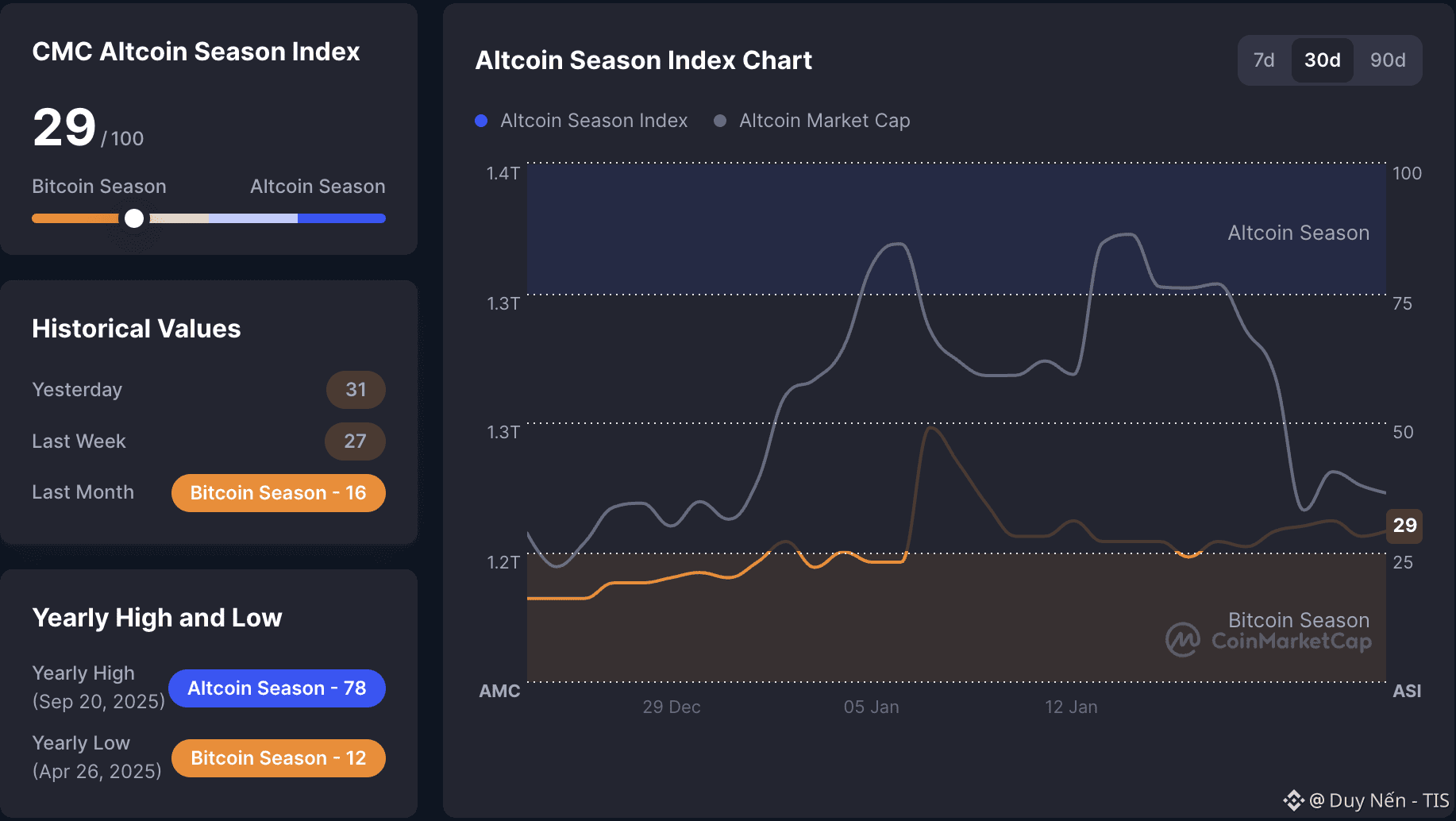 🔸Tin buồn cho anh em đang ôm coin cỏ là chỉ số Altcoin Season Index đã tụt xuống mức 29/100, xác nhận thị trường đang nằm hoàn toàn trong tay $BTC . Mức điểm này cho thấy vốn đang bị rút khỏi Altcoin để chảy ngược về BTC hoặc nằm im chờ thời. So với đỉnh cao 78 điểm hồi tháng 9/2025, rõ ràng động lực tăng trưởng của Altcoin đã nguội lạnh.