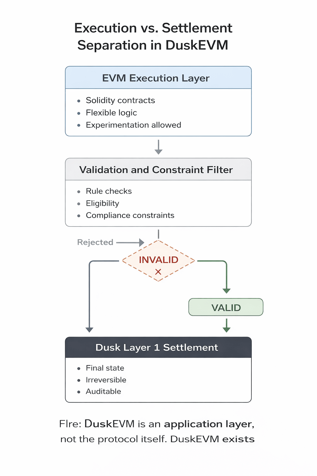 Thay vì coi EVM như một môi trường thực thi tự do, Dusk định vị nó như một lớp ứng dụng được giải quyết vào một Layer 1 nơi: