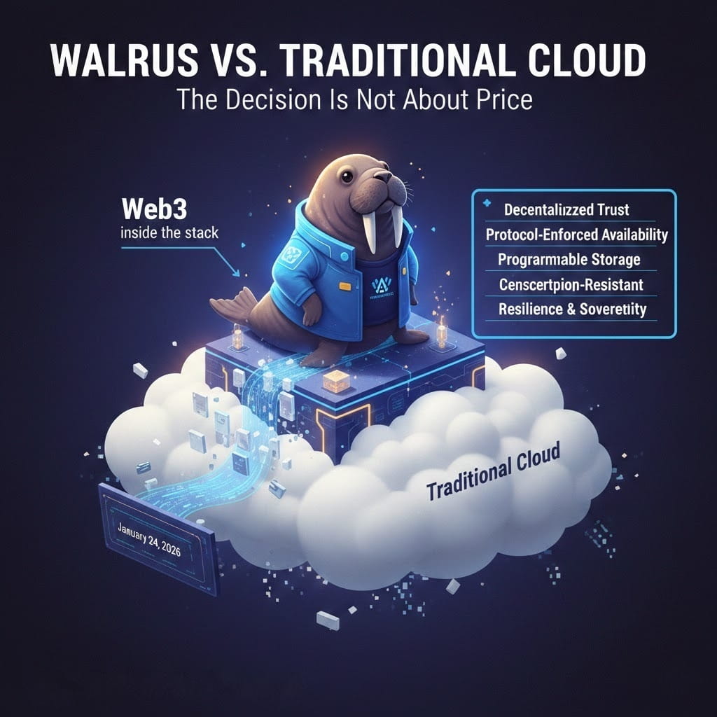 So sánh Walrus với các nhà cung cấp đám mây truyền thống chỉ dựa trên giá cả là bỏ qua điểm quyết định thực sự. Những hệ thống này được xây dựng trên những giả định khác nhau, và chi phí mỗi gigabyte không phải là chỉ số quan trọng nhất cho các ứng dụng bản địa Web3.