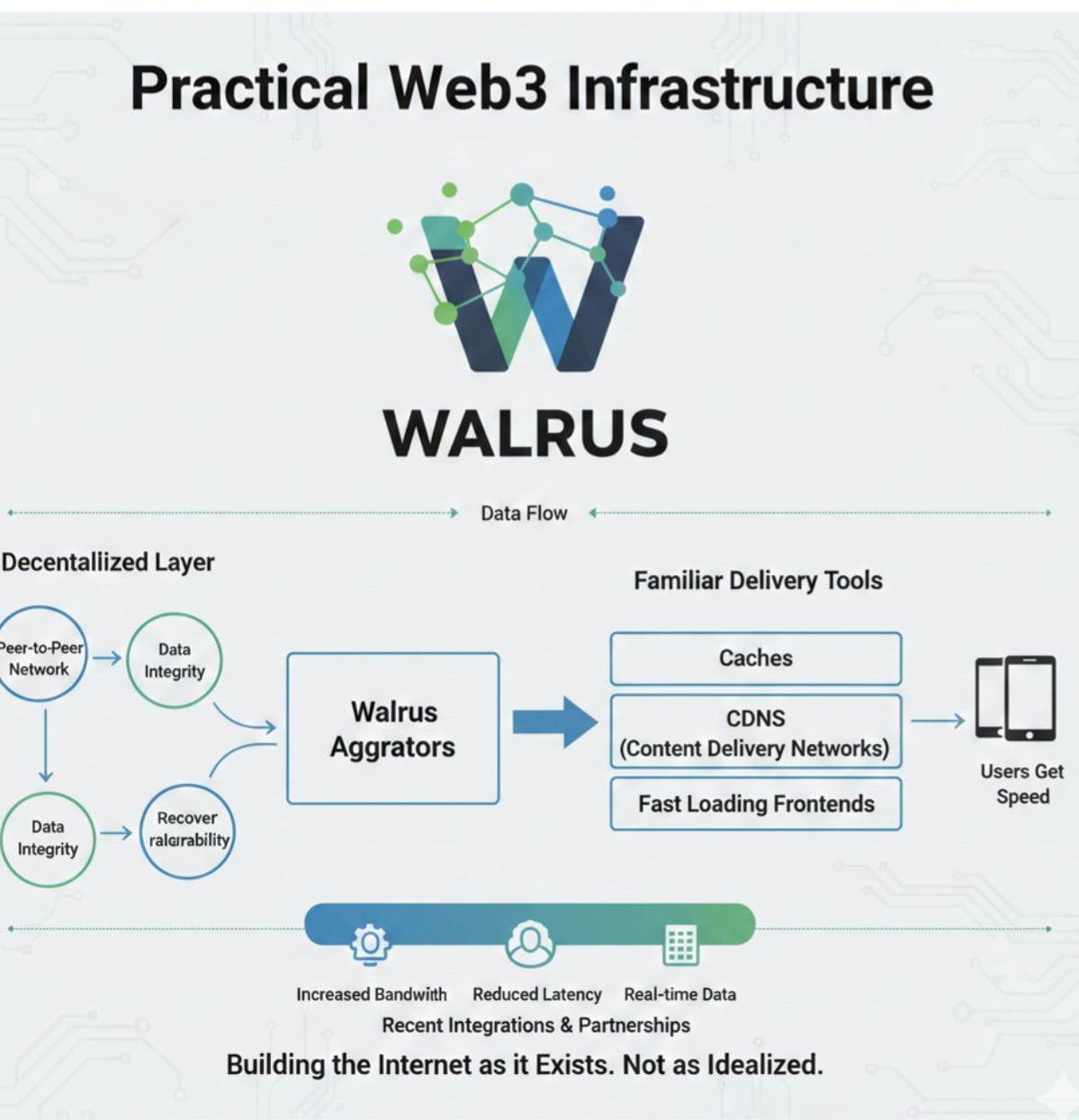 Speed is another area where Walrus makes a grounded choice. Many Web3 systems pretend that traditional infrastructure does not exist, or worse, that it should be replaced entirely. Walrus does not play that game. It accepts a simple truth: users expect fast loading times. Frontends cannot wait for slow peer-to-peer retrieval when a page loads. Walrus is designed so that data access can flow through aggregators and be served via caches or CDNs. This does not undermine decentralization. It complements it. The decentralized layer ensures data integrity and recoverability, while familiar delivery tools handle performance. Users get speed. Developers avoid painful trade-offs. The system works with the internet as it exists, not as an idealized version of it.