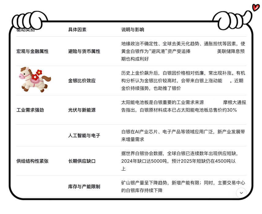 Đặc điểm vĩ mô và tài chính: Tính an toàn và thuộc tính tiền tệ, sự không chắc chắn về địa chính trị, xu hướng toàn cầu loại bỏ đô la, lo ngại về lạm phát và các yếu tố khác, khiến vàng và bạc trở thành tài sản ‘nơi trú ẩn’ được ưa chuộng. Dự đoán giảm lãi suất của Cục Dự trữ Liên bang cũng tạo ra lợi ích.