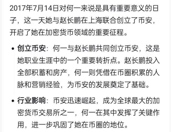 #2017714 :2017年7月14日对何一来说意义重大,这一天币安迎来了现任首席执行官,这一天她与赵长鹏在上海联合创立了币安,开启了她在币圈的又一段重要征程。