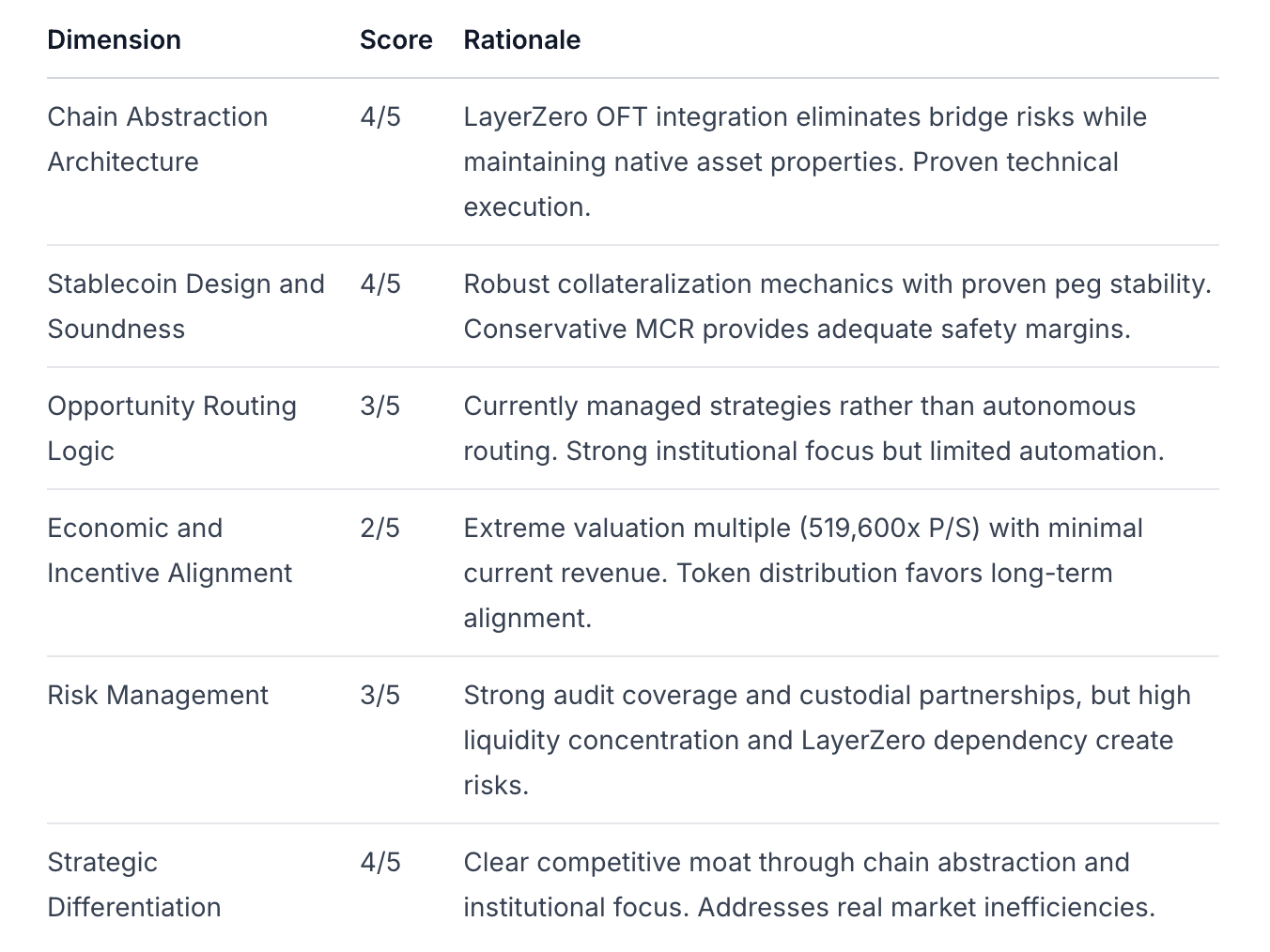 đại diện cho một sự chuyển mình từ cơ sở hạ tầng stablecoin truyền thống sang phân bổ vốn trừu tượng chuỗi. Mặc dù giao thức thể hiện động lực mạnh mẽ từ tổ chức với $12M tài trợ chiến lược và ~$162M TVL, bội số P/S hiện tại 519,600x và hồ sơ thanh khoản tập trung cho thấy rủi ro thực thi giai đoạn đầu mà phải được cân nhắc so với sự khác biệt kiến trúc của nó.