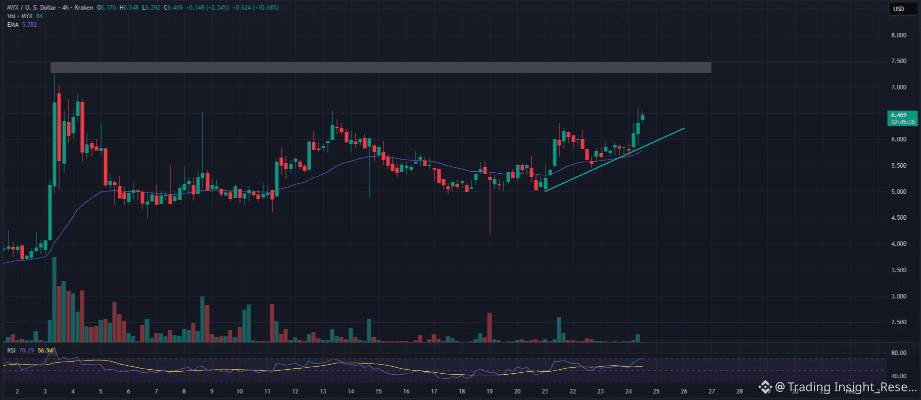 Giá đã biến mức Fibonacci 23.6% ($6.19) thành hỗ trợ. Miễn là MYX giữ trên đường SMA 7 ngày, thiên hướng tăng giá vẫn còn nguyên vẹn.
