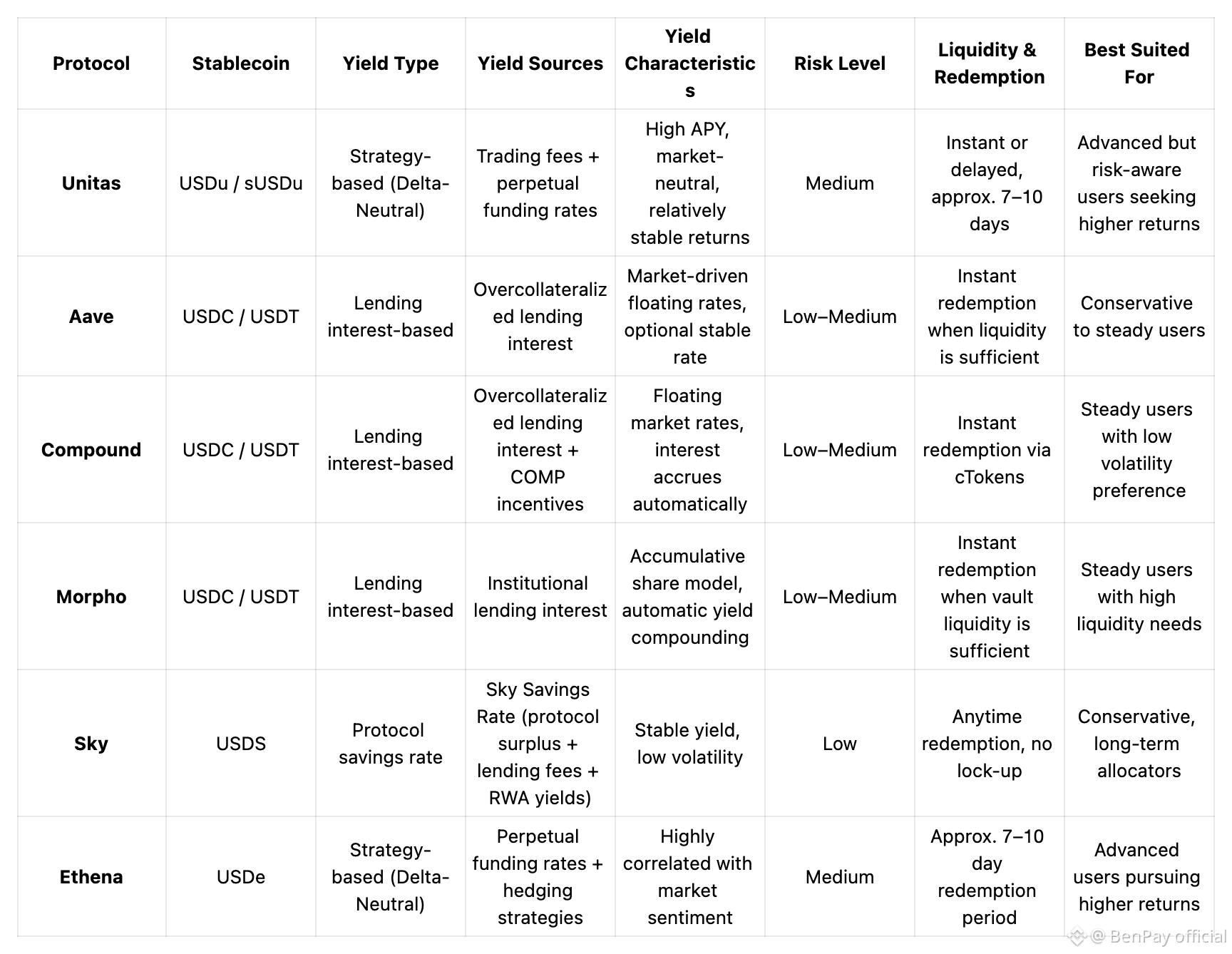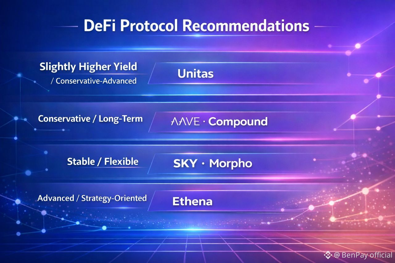 If you are seeking stable, low-volatility stablecoin yields, Sky, Morpho, AAVE, and Compound protocols are more suitable. If you are willing to accept some market fluctuations for potentially higher returns, the Unitas protocol is a good choice. If you can tolerate market sentiment–related risks, the Ethena protocol may offer the highest returns.
