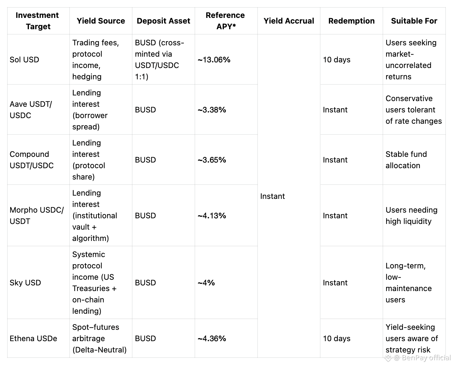 The following table provides a quick comparison of the stablecoin yield strategies currently available through BenPay DeFi Earn.