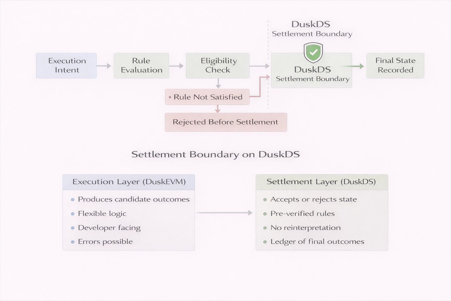 Thực thi trên DuskEVM tạo ra các kết quả ứng cử viên. Những kết quả đó chỉ trở thành trạng thái sau khi vượt qua các ràng buộc được thực thi tại ranh giới DuskDS. Sự tách biệt đó không phải là ngẫu nhiên. Nó cho phép thực thi phát triển mà không để phức tạp rò rỉ trực tiếp vào thanh toán.