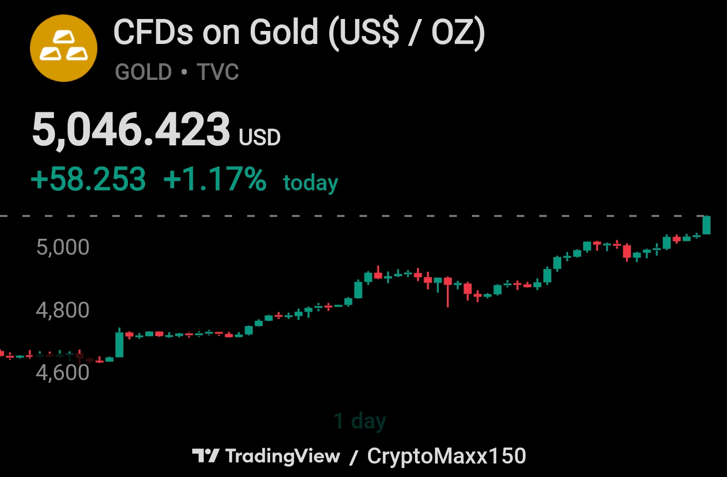 Ngược lại, biểu đồ thứ hai cho thấy giá vàng tăng lên $5,100.423 mỗi ounce, đánh dấu mức tăng 2% trong ngày. Sự gia tăng này phản ánh sở thích mới của các nhà đầu tư đối với các tài sản trú ẩn an toàn trong thời kỳ căng thẳng khí hậu và kinh tế.