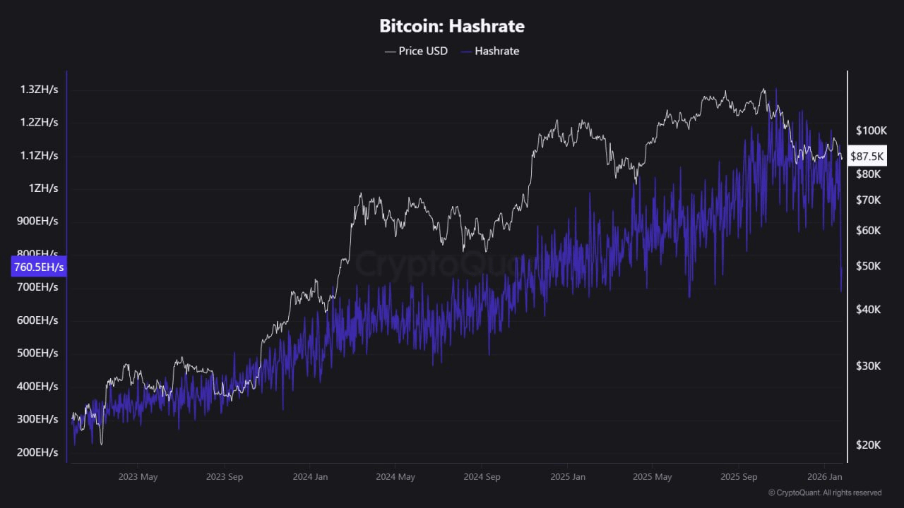 Biểu đồ đầu tiên minh họa sự sụt giảm rõ rệt trong hashrate của Bitcoin (được hiển thị bằng màu xanh) trong những ngày cuối tháng 1 năm 2026, cùng với sự biến động giá của Bitcoin (được hiển thị bằng màu trắng). Sự sụt giảm đáng kể này không phải do một sự cố kỹ thuật, mà là do việc ngừng hoạt động của các cơ sở khai thác lớn do cơn bão mùa đông nghiêm trọng.