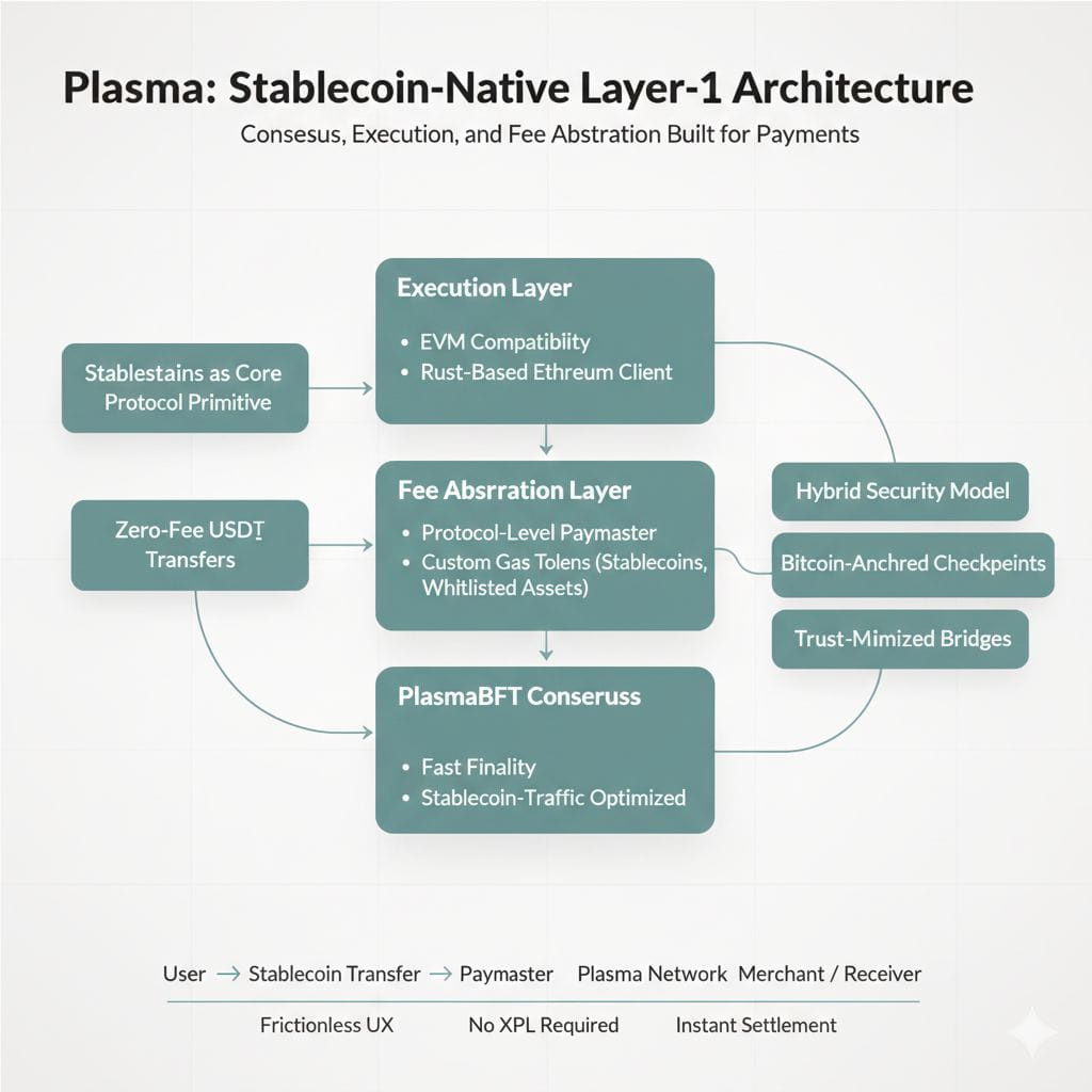 Plasma ka architecture teen cheezon par built hai: consensus, execution aur fee abstraction. PlasmaBFT consensus deterministic aur fast finality offer karta hai, jo high-frequency stablecoin traffic ke liye zaruri hai. Saath me, network EVM compatible hai, jisse developers familiar Ethereum tooling se bina changes ke contracts deploy kar sakte hain.