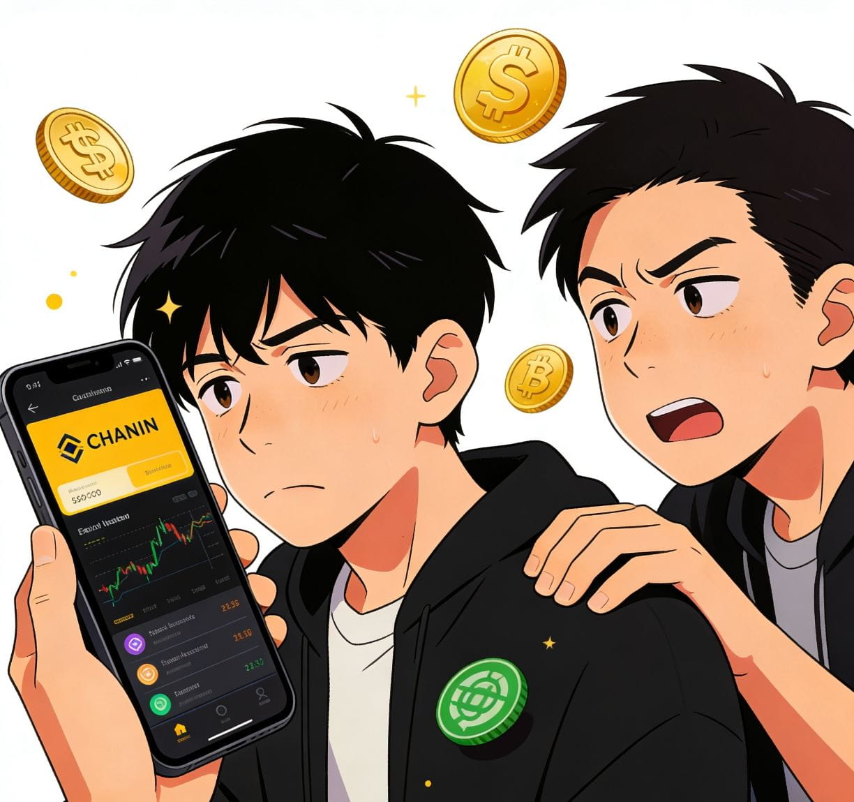 (最后他拍了拍我:“兄弟,你过得……是不是有点太‘币安’了?”)朋友的手搭在我的肩膀上,脸上带着一丝调侃又无奈的笑容,而我则拿着手机,眼神中带着些许迷茫。