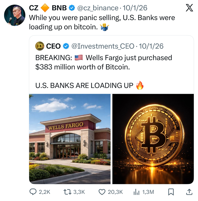 1️⃣ Khi tin tức nổ ra rằng Wells Fargo vừa mua $383 triệu trị giá $BTC, CZ ngay lập tức đã đăng: