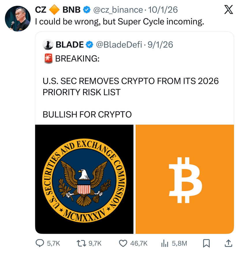 2️⃣ Khi Ủy ban Chứng khoán và Giao dịch Hoa Kỳ đã loại bỏ crypto khỏi danh sách rủi ro ưu tiên của mình cho năm 2026, CZ đã chia sẻ: