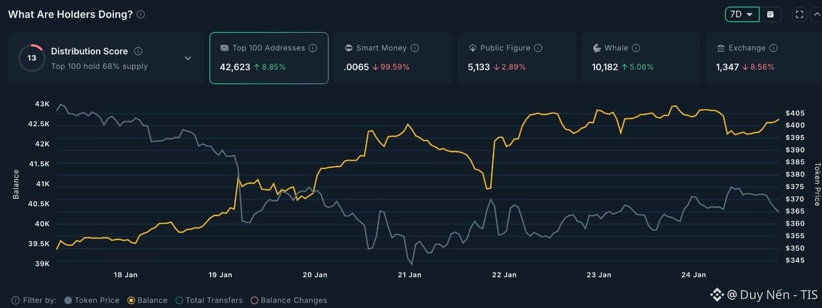 Sau cú sập kinh hoàng 42% trong hai tuần qua, các cá voi đang dắt nhau đi hội chợ. Dữ liệu từ Nansen chỉ ra Top 100 ví cá mập đã tăng lượng nắm giữ thêm 8.85%. Vol giao dịch cũng dựng cột tăng 43% lên gần nửa tỷ đô, chứng tỏ dân tình đang lao vào bắt đáy ầm ầm chứ không sợ hãi.